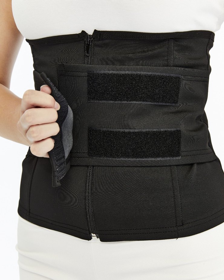 Siyah renkte, midi uzunlukta ve desensiz fitilli hemşire korsesi. Fermuar ve ayarlanabilir cırt cırt bantlarla destek ve konfor sağlar.