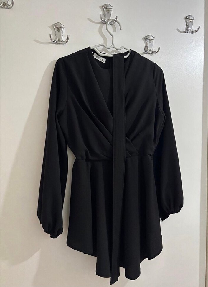 Siyah, uzun kollu,Bel detaylı ve bol kesimdir. İpeksi kumaştan, minimalist gotik tarzda, ofis kullanımı için uygundur. M beden markayı belirttim