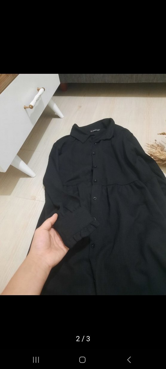 Siyah tesettür gömlek,m l uyumlu uzun kollu ve yakalıdır. Bol kesimi ve düğmeli ön kısmıyla minimal ve rahat bir tarz sunar. Günlük kullanım için uygundur.