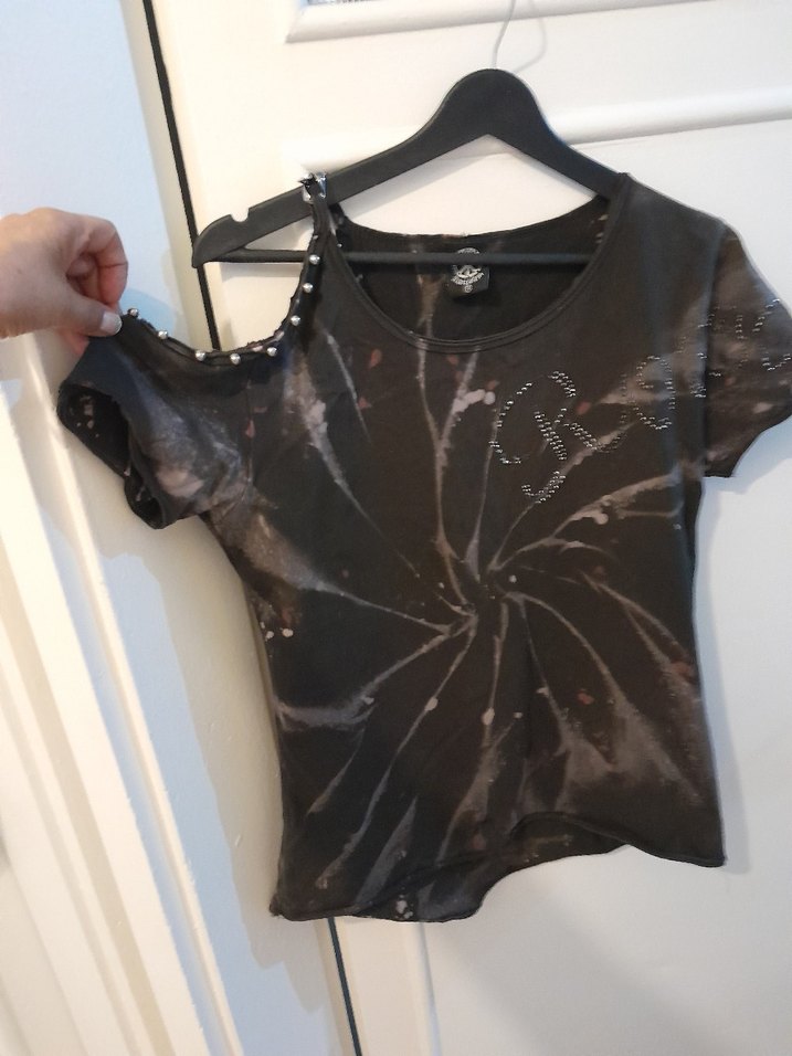 kısa kollu ve yuvarlak yakalı siyah tişört. tek omuz açık tie-dye deseni bulunur. M beden