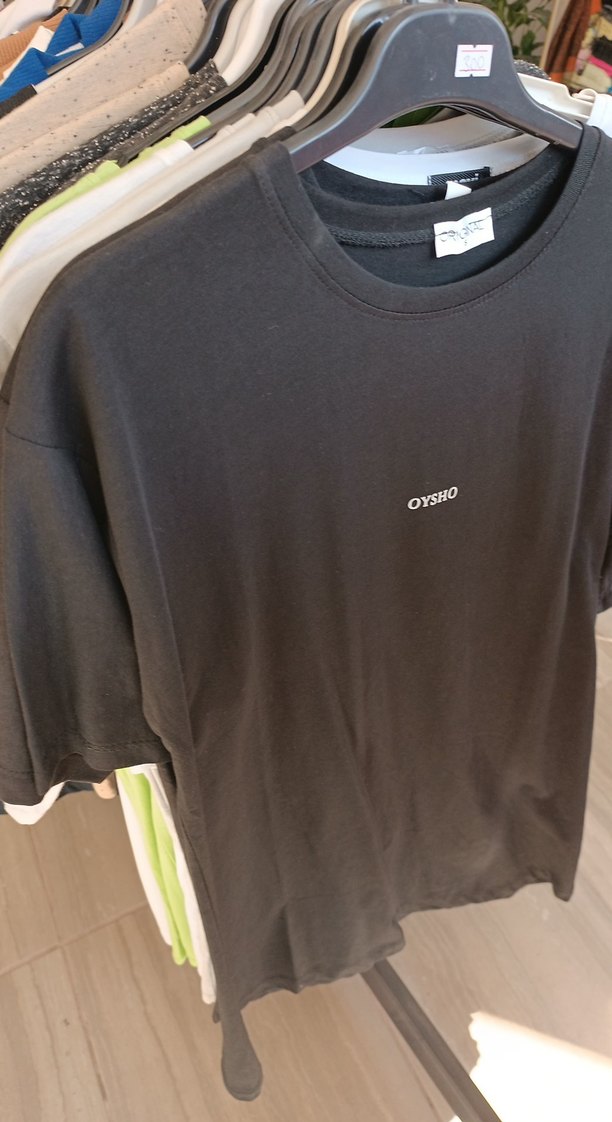 Siyah, kısa kollu tişört, salaş kesim ve yuvarlak yaka. OYSHO baskılı, sentetik yumuşak kumaştan, günlük rahat tarz için uygun.