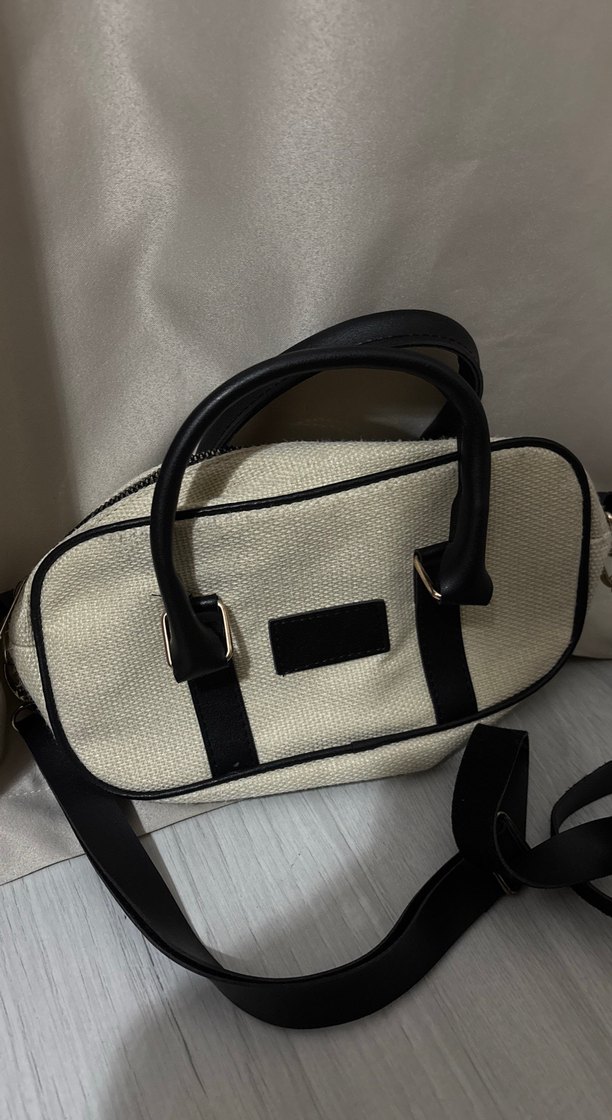 Siyah tokalı beyaz minimalist çanta, sentetik kumaş saplara sahip, trend sokak stili için uygun.