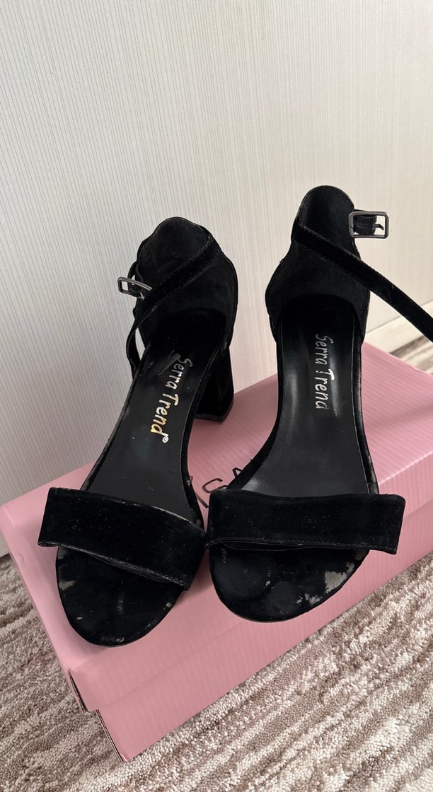 Siyah tokalı bantlı, blok topuklu, kauçuk tabanlı, cesur gotik tarzda kadın abiye ayakkabısı. Marka: Serratrena.