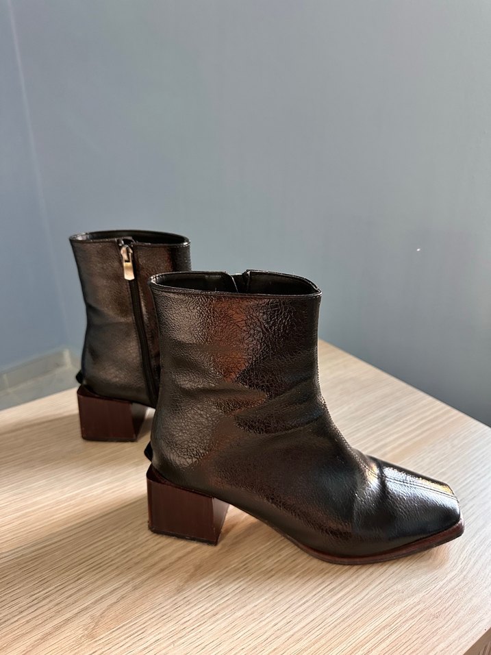 Siyah deri kadın bot, blok topuk ve tokalı detaylara sahip. Gotik tarzı Paris avant-garde modasıyla buluşturur. Günlük kullanıma uygun. BUTİK ÜRÜNÜDÜR.
