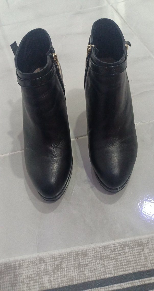 Siyah deri, tokalı ve stiletto topuklu botlar, minimalist ve çağdaş tasarıma sahip, günlük kullanıma uygun. çok az giyilmistir tertemiz sıfırdan farksızdır 9cm topuk boyu