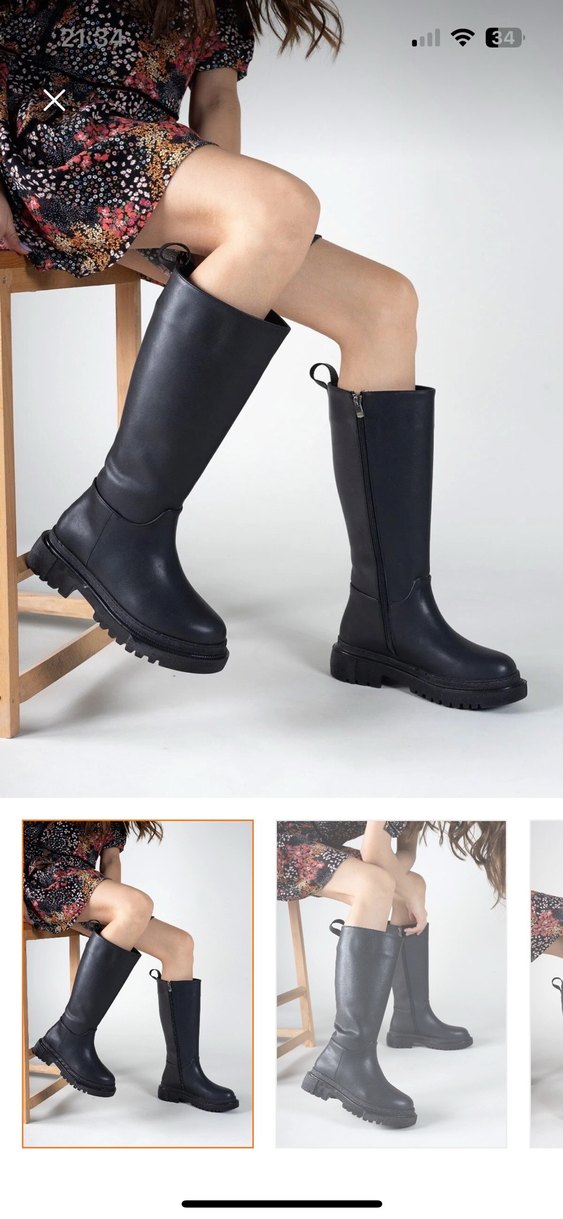 Siyah kauçuk diz boyu bot, kalın topuklu ve tokalı detaylı, günlük kullanım ve sokak stili için uygundur.