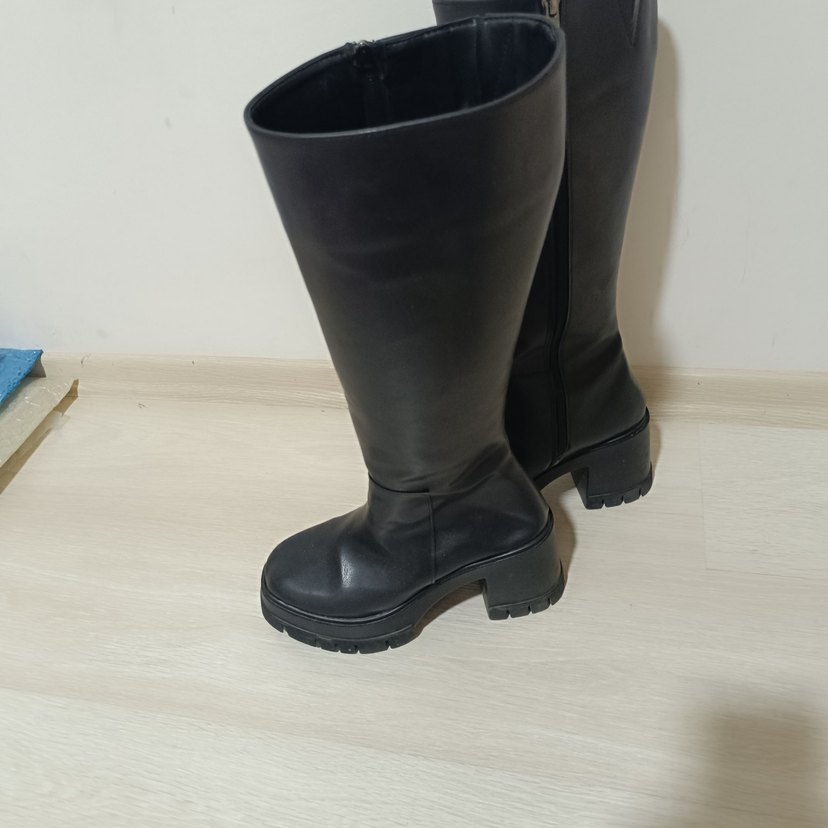 Siyah tokalı dizüstü kadın bot, kauçuk malzemeden blok topuklu. Goth sokak stiline uygun, trend ve günlük kullanım için ideal.