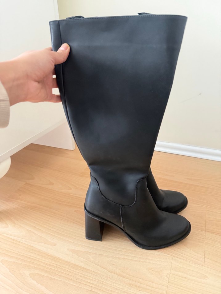 Siyah, tokalı, blok topuklu, kauçuk malzemeden yapılmış dizüstü kadın botu. Minimalist gotik tarzıyla günlük şıklık için uygun. Sağlam sıcak tutan bir çizme