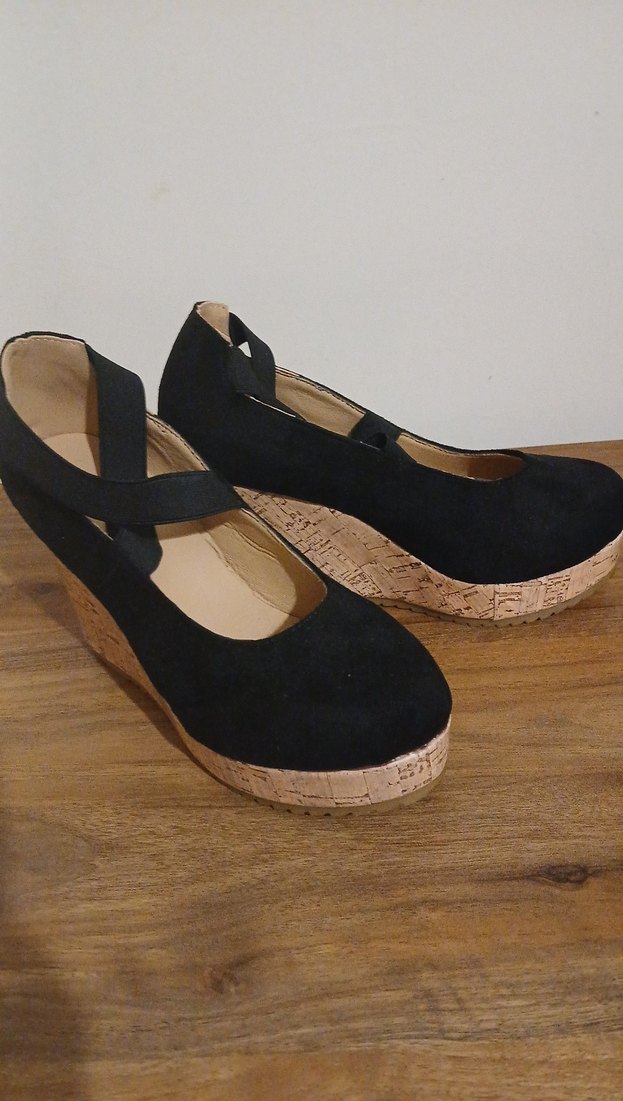 Kork görünümlü tabana ve tokalı bant detayına sahip siyah dolgu topuklu ayakkabı, günlük kullanım için kauçuk malzemeden üretilmiştir.