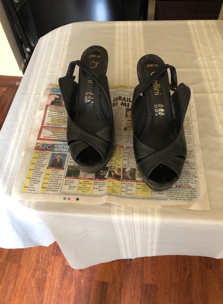 Tokalı bantlı, baskılı tasarımlı siyah dolgu topuklu kadın ayakkabısı. Kauçuk malzemeden, günlük kullanım için uygundur. Marka: Ellini.