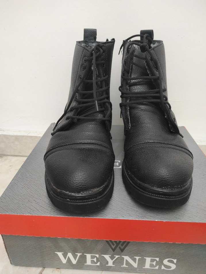 Siyah kauçuk erkek goth botları, tokalı detaylar ve bağcıklarla, WEYNES marka. Günlük kullanıma uygun koyu renkte, desensiz tasarım.