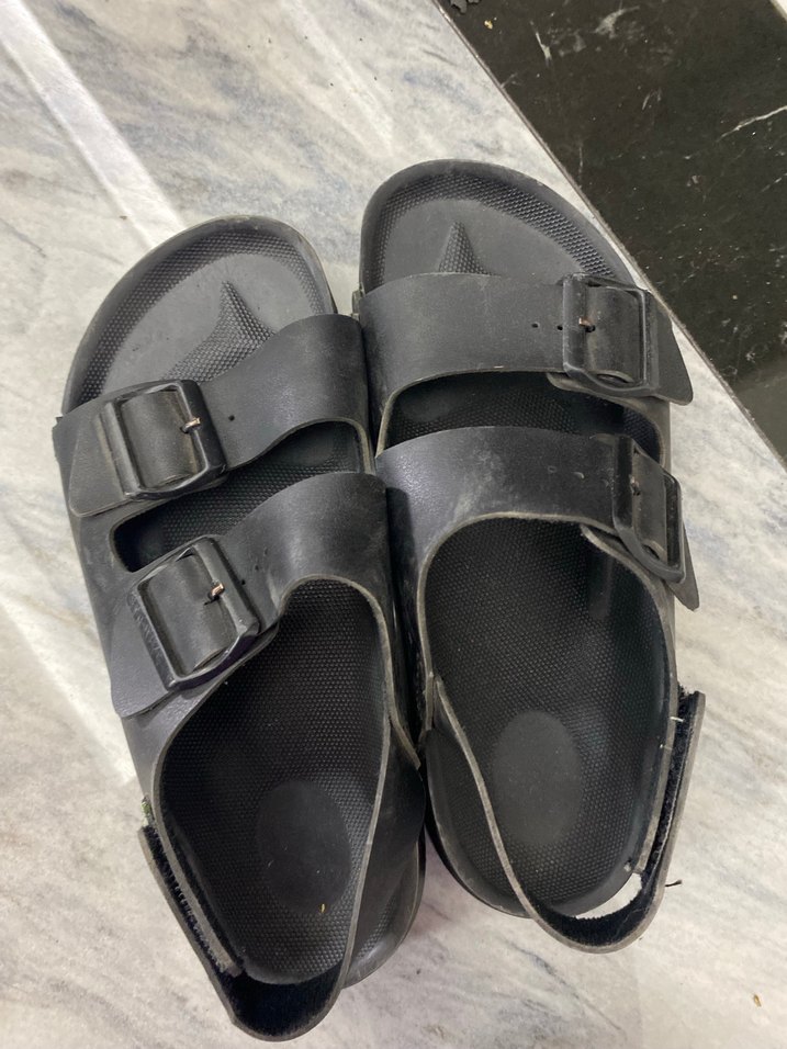 Ayarlanabilir tokalı, siyah kauçuk erkek terlik. Minimalist ve desensiz tasarımıyla günlük sokak kullanımı için uygun.