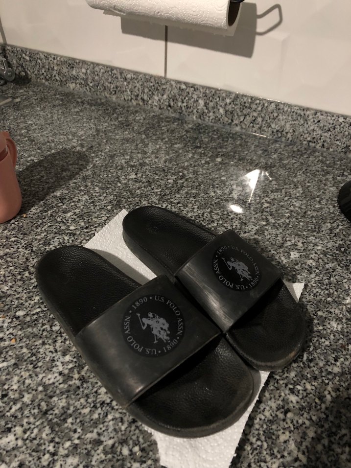 Siyah renkte, tokalı ve baskılı desenli erkek terliği. Rahat kauçuk tabanlı, günlük sokak stiline uygun. UNISEX