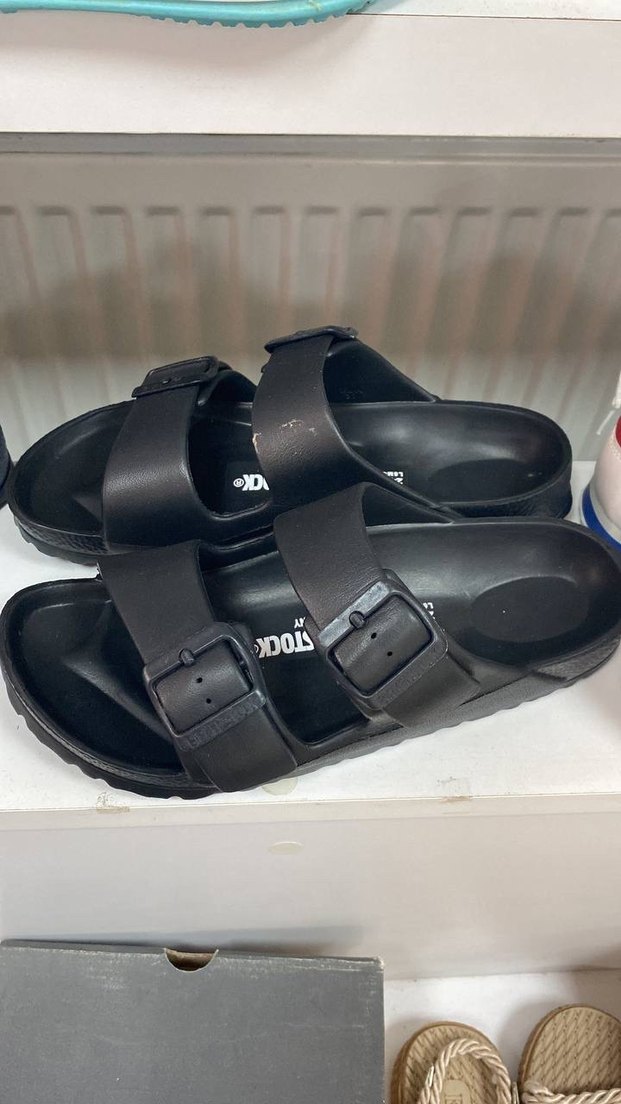 Dayanıklı kauçuk malzemeden yapılmış, ayarlanabilir tokaları olan siyah erkek terlik. Günlük sokak tarzı için minimal tasarım. 37-39-40 Siyah 37 no