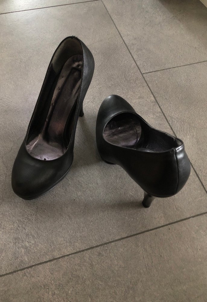 Siyah tokalı, lastik malzemeden yapılmış gotik stilettolar. İnce topuklu, ofis için cesur bir stil sunar.