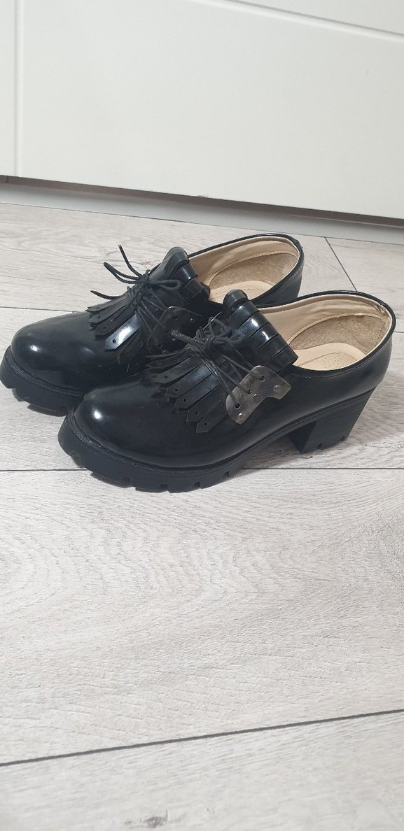 Siyah, tokalı ve gotik tarzda, kauçuk malzemeden blok topuklu kadın ayakkabısı. Ofis kullanımı için uygun.
