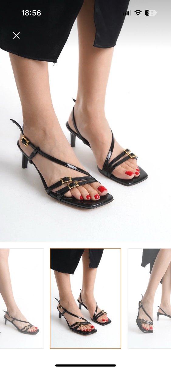 Çok iyi durumda kısa topuklu rugan sandalet Marka: Trendyol Shoes Renk: Siyah Numara: 38 (tam kalıp) İyi durumdadır, 1-2 kez giyildi sadece, bir hasarı yok