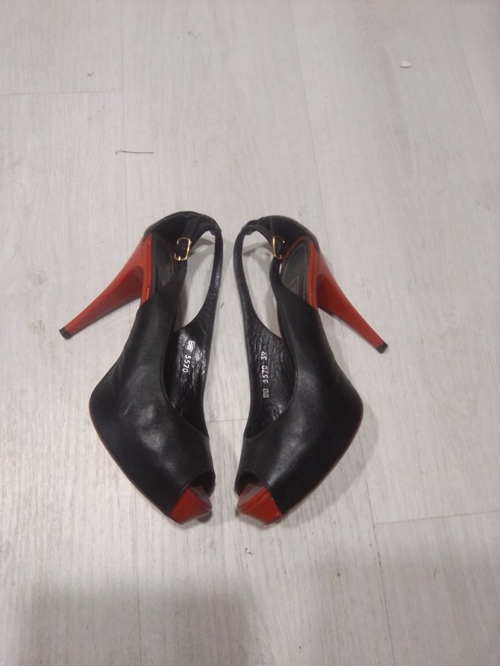 Siyah , tokalı bantlı, kırmızı topuklu kauçuk ince topuklu. Cesur, gotik tarz için uygun.