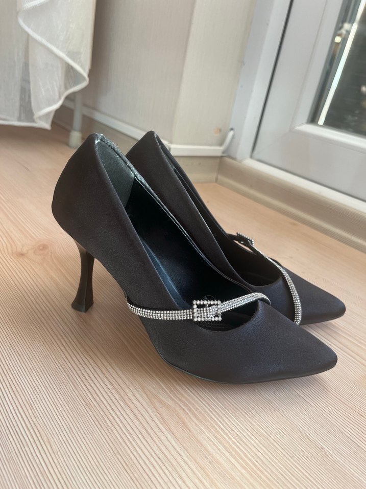 Siyah tokalı ince topuklu, desensiz ve ofis kullanıma uygun kauçuk malzemeden abiye ayakkabı. Bir kere giyildi. Hemen kargo yapıyorum