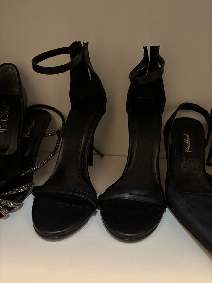Siyah ince topuklu, tokalı bilek kayışlı kadın abiye ayakkabı. Minimalist ve gotik tarzda, pürüzsüz malzemeden, romantik akşamlar için uygundur.