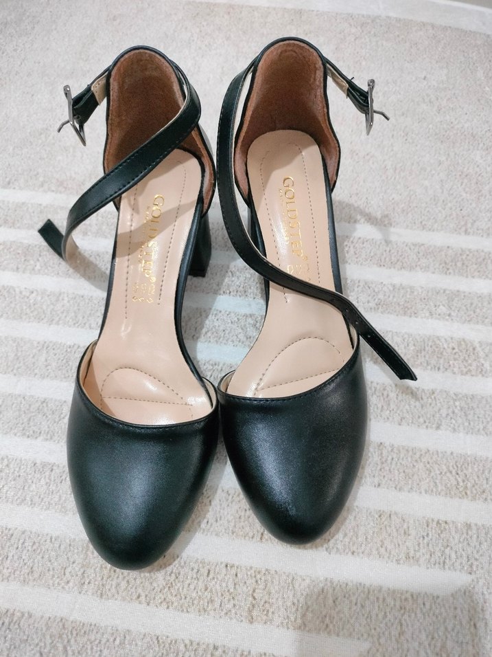 Siyah tokalı, ince topuklu kadın ayakkabısı. Kauçuk malzemeden, klasik goth tarzında, günlük kullanıma uygun.