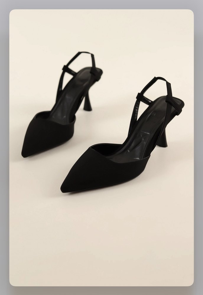 Siyah tokalı ince topuklu kadın ayakkabı, minimalist ve çağdaş tasarıma sahip, romantik akşamlar için uygun. Kauçuk malzemeden üretilmiştir.
