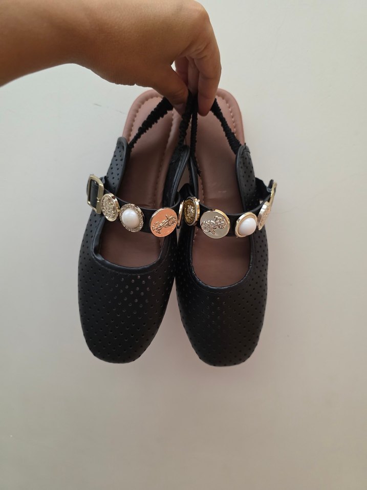 Siyah tokalı ve blok topuklu kadın babet. Kauçuk malzemeden üretilmiş, Paris sokak modası ve trend günlük stilini yansıtıyor. kalıbı bir beden küçük