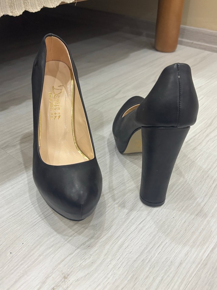 Siyah renkte, tokalı ve blok topuklu kadın stiletto. Modern klasik tarzda, ofis kullanımı için uygundur.