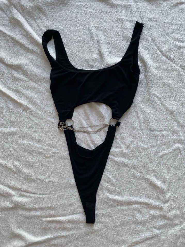 Tokalı detaylar ve zincir aksanlı, askılı siyah kadın bluz, gotik athleisure tarzını yansıtıyor.