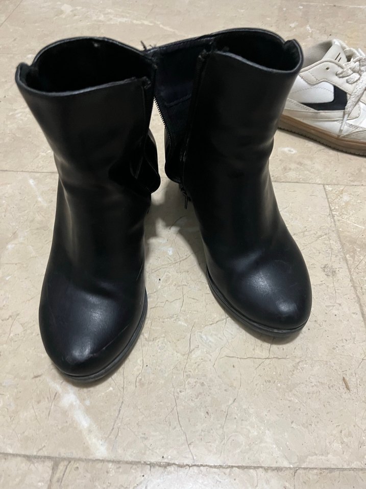 Siyah renkte, kalın topuklu ve tokalı kadın botu. Minimalist gotik tarzıyla günlük kullanıma uygun kauçuk malzemeden üretilmiştir.
