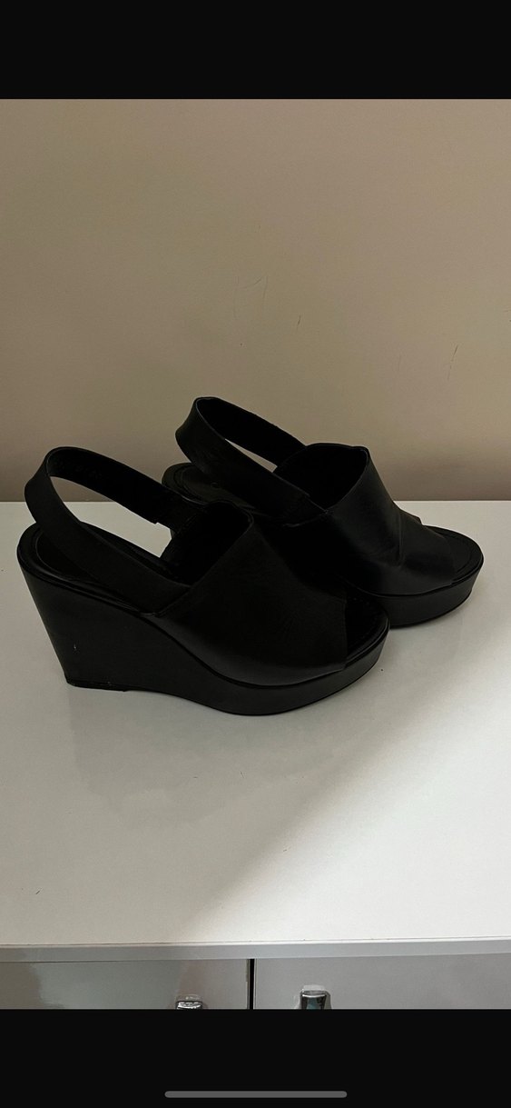 Siyah, tokalı bantlı dolgu topuklu ayakkabılar, kauçuk malzemeden üretilmiştir. Minimalist ve gotik tarzda, gündelik kullanıma uygun koyu renkte ve desensiz.