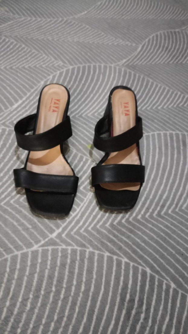 Siyah, tokalı kayışları ve dolgu topukları olan kadın terlikleri.