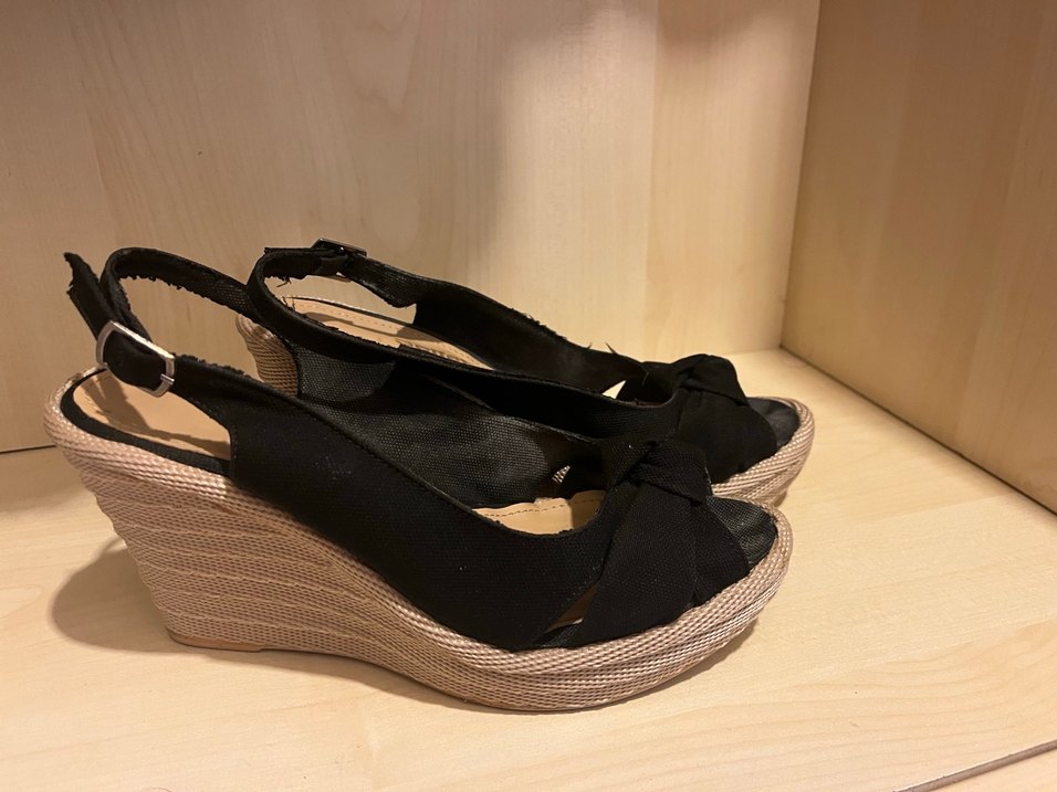 Siyah tokalı,hasır tabanlı dolgu topuklu ayakkabı, minimalist ve çağdaş tasarıma sahip, günlük kullanıma uygun.