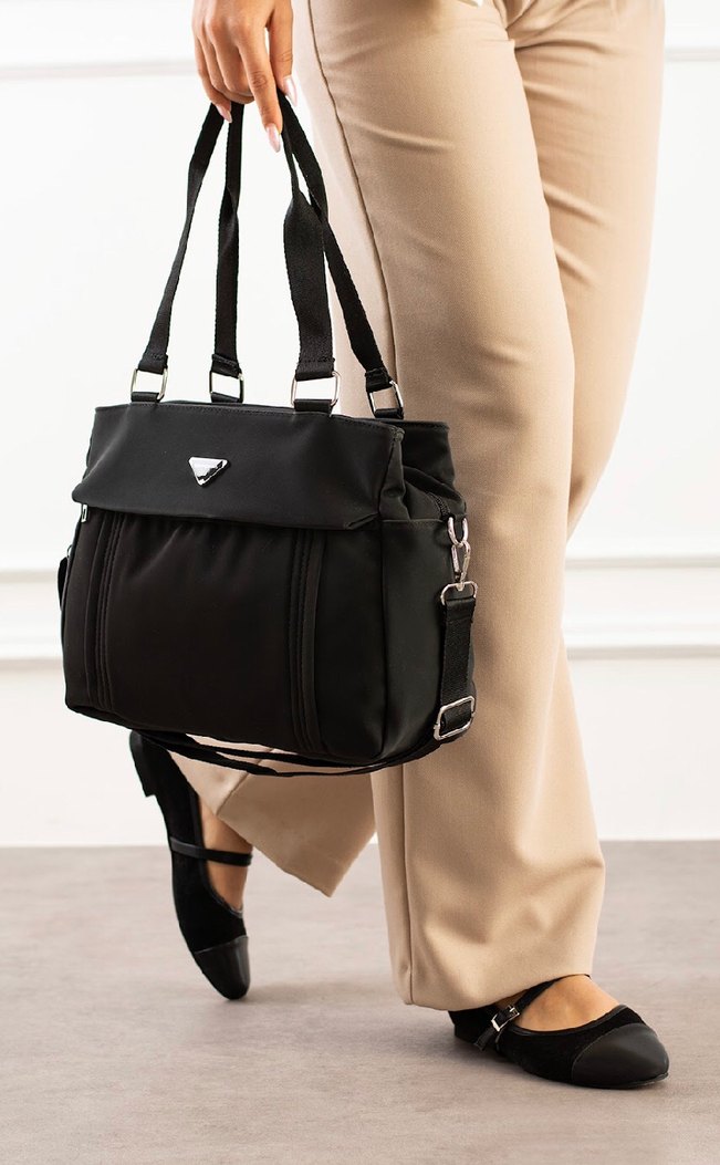 Siyah renkte tokalı, sentetik kumaştan kadın günlük çanta. Çoklu askılarıyla çeşitli taşıma seçenekleri sunar, desensiz ve şık görünümlüdür. 5 gözlüdür.