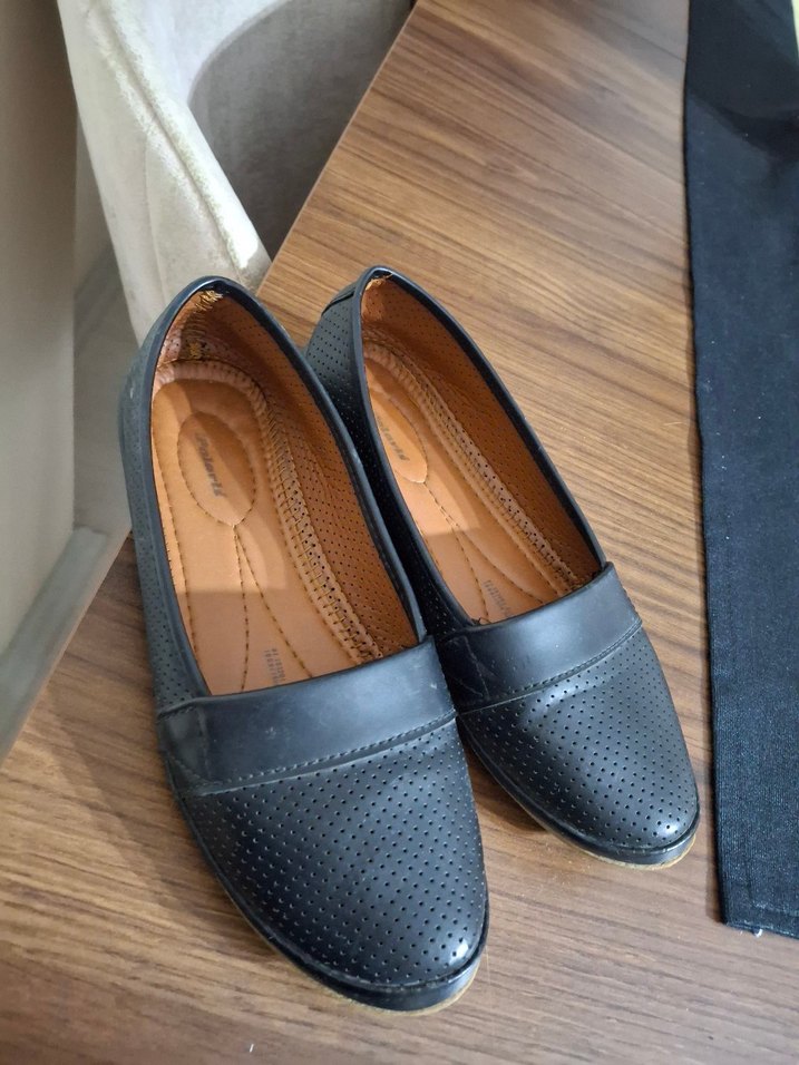 Siyah tokalı, kauçuk malzemeden yapılmış blok topuklu kadın babet. Minimalist ve desensiz tasarımıyla günlük kullanıma uygundur.