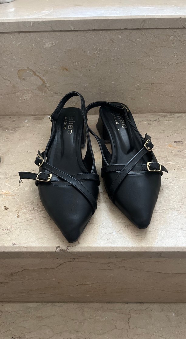 Siyah, tokalı bantlı, blok topuklu kadın klasik ayakkabı. Minimalist ve gotik tarzda, ofis kullanımı için uygun, lastik malzemeden. Ayağıma küçük geldiği için kullanmadım hiçbir şekilde bir sorunu yoktur
