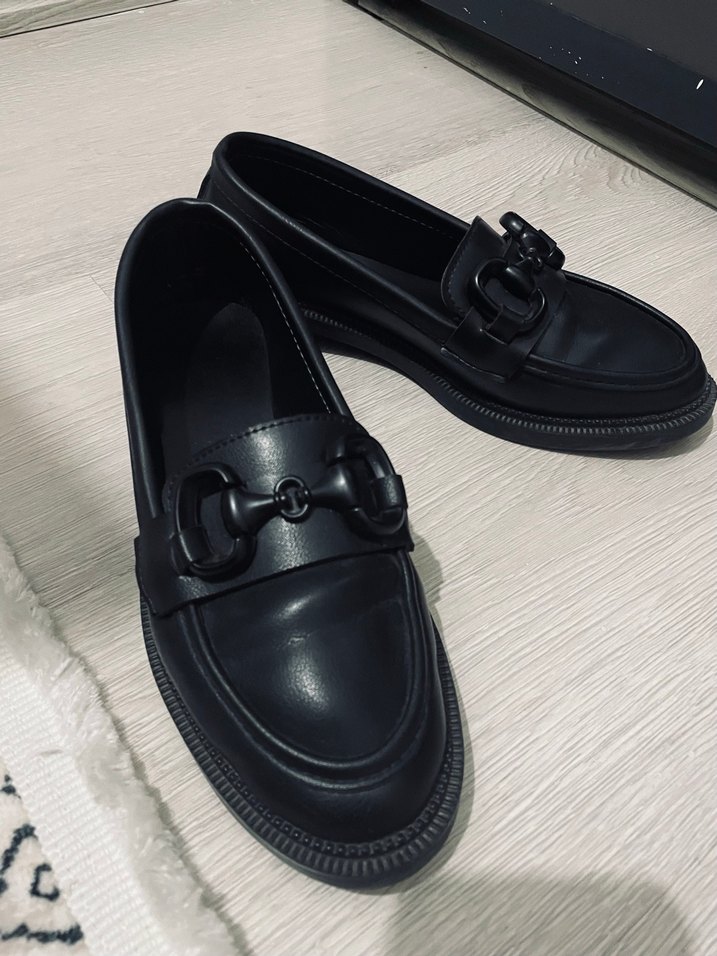 Az kullanılmış Siyah, tokalı ve blok topuklu kauçuk kadın loafer. Ofis için uygun, trendy casual goth tarzında. Herhangi bir defo yırtık çizik vs yoktur