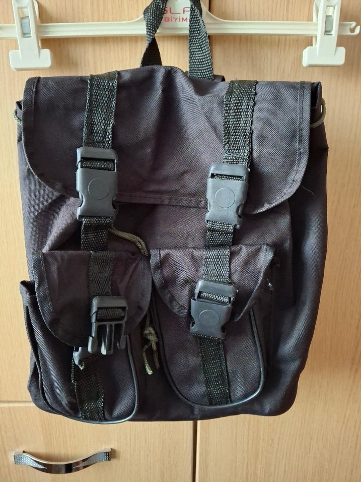 Siyah tokalı sırt çantası, günlük sokak stiline uygun sade tasarıma sahiptir. Birden fazla cepli, sağlam görünümlü. Biraz kullanılmış iç kısmının az dikiş yeri deforme olmuş ,resimde gözüküyor