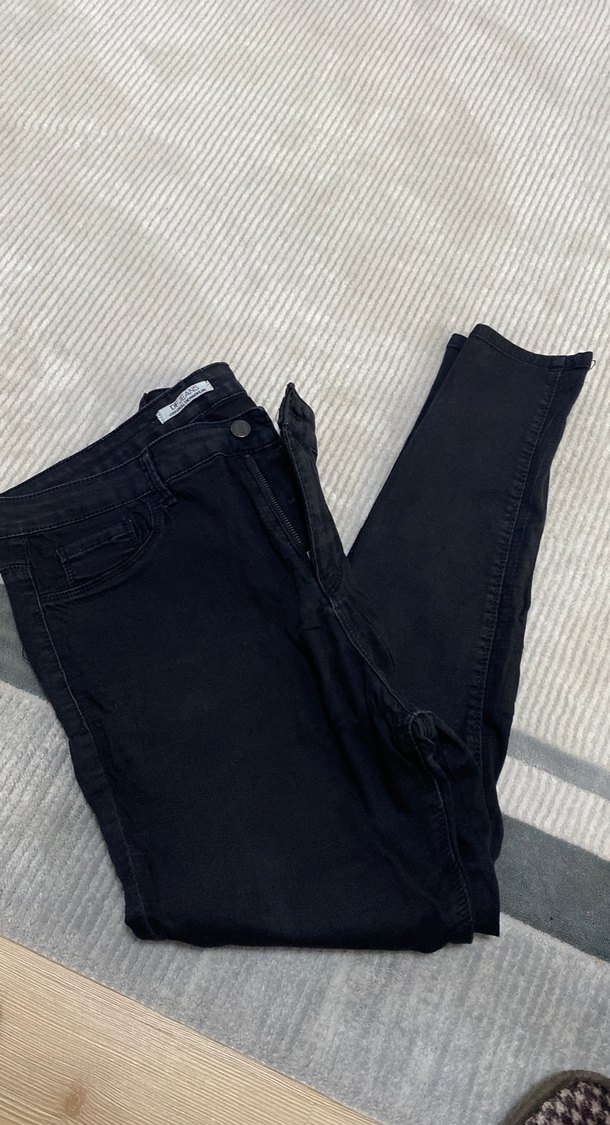 Siyah renkte, tokalı ve normal midi boyda, denimden yapılmış dar kesim kadın jean. Sokak stili için uygun, günlük kullanıma uygun. Likralı yüksek bel