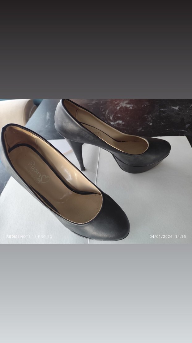 Siyah tokalı, modern klasik tasarımlı kadın stiletto. İnce topuklu ve ofis kullanımı için uygun.