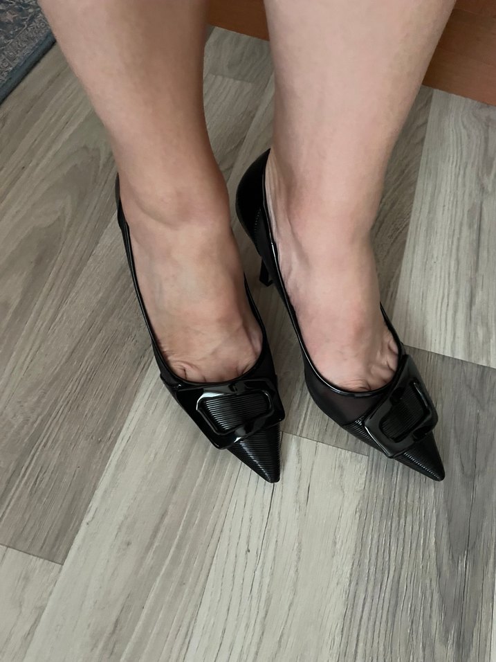 Siyah, tokalı ve sivri burunlu stiletto topuklu ayakkabılar, ofis için uygun, cesur gotik tarzda, kauçuk malzemeden yapılmıştır.