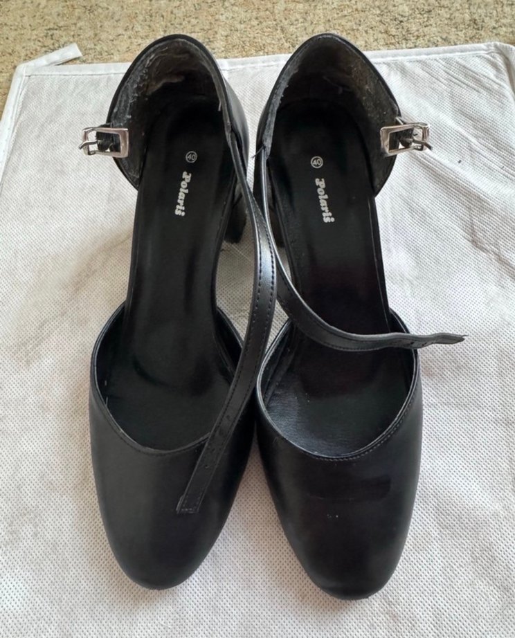 Siyah, tokalı bantlı, lastik malzemeden blok topuklu kadın akşam ayakkabısı. Minimalist gotik tarzda, desen içermeyen rahat tasarım.