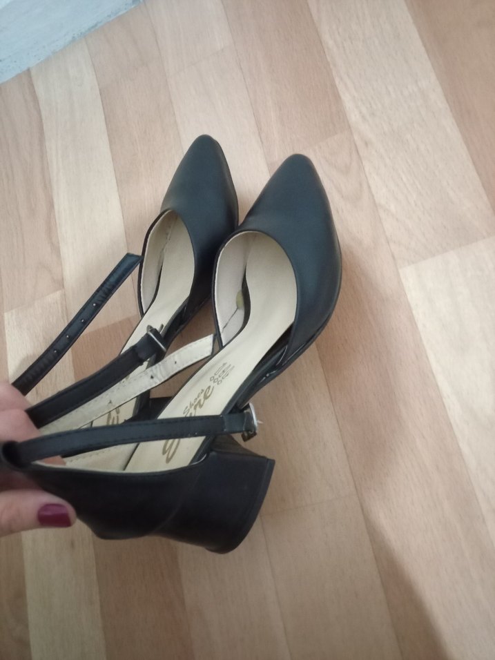 Siyah, tokalı kayışlı, blok topuklu kadın topuklu ayakkabı. Düz kauçuk malzemeden, klasik tarzda. Bir kez giyildi tertemiz defosu yok marka temsili