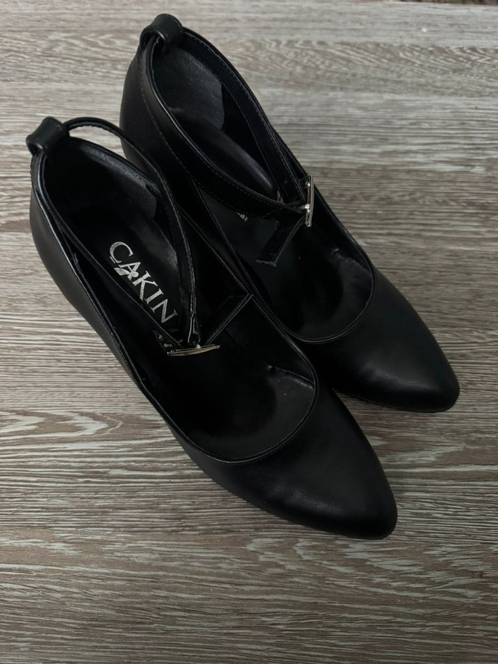 Siyah, tokalı, blok topuklu kadın ayakkabısı. Ofis için uygun, klasik gotik tarzda, CAKIN markalı.