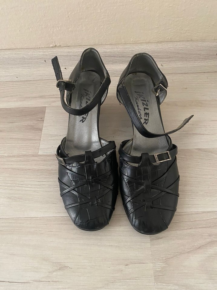 Siyah, tokalı bantlara ve kalın topuklara sahip kadın sandaletleri. Kauçuk malzemeden yapılmış, vintage goth tarzında, günlük kullanım için uygun.