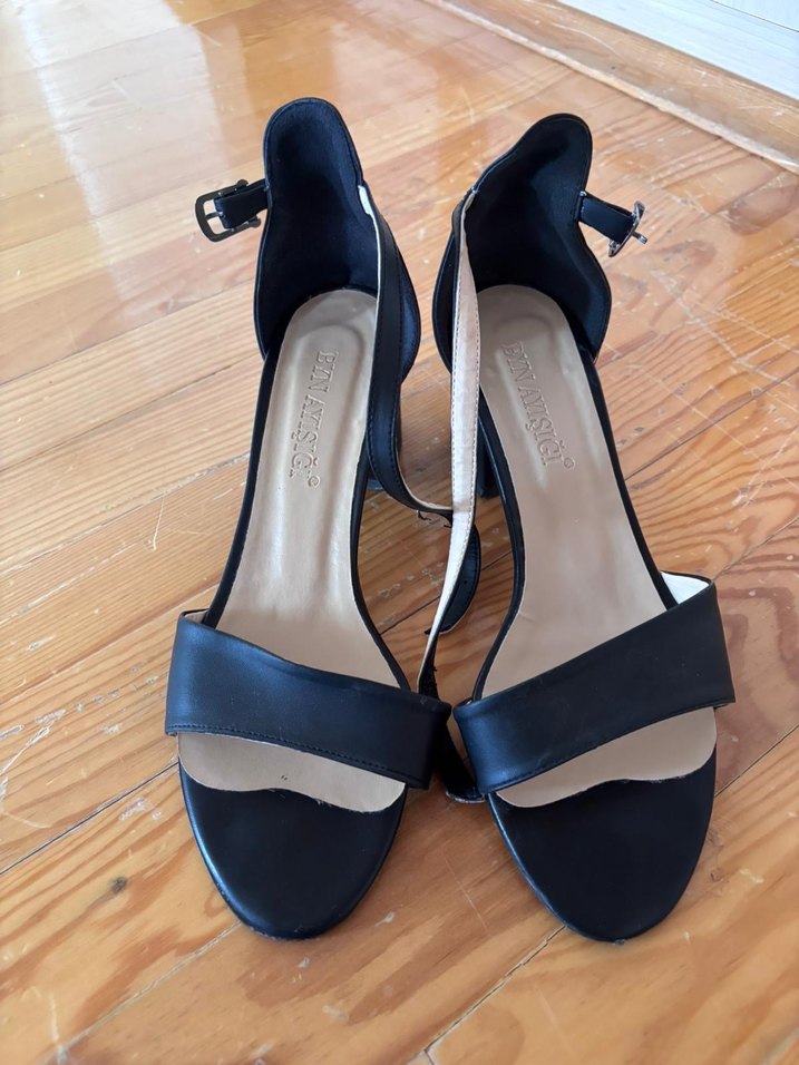 Siyah, tokalı bilek kayışlı, blok topuklu kadın gece sandaletleri. Minimalist ve gotik tarzda, romantik akşamlar için idealdir. Kauçuk tabanlı.