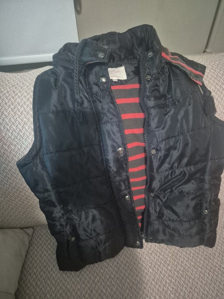 Siyah tokalı kemerli, sentez kumaştan kadın yeleği. Kolsuz, normal boy ve notched lapel yakalı, günlük kullanıma uygun.