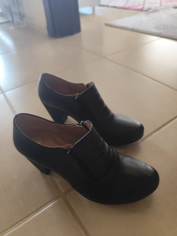 Siyah tokalı, blok topuklu kadın klasik ayakkabı. Kauçuk tabanlı, ofis stiline uygun gotik detaylar içerir. pazarlık payı vardır