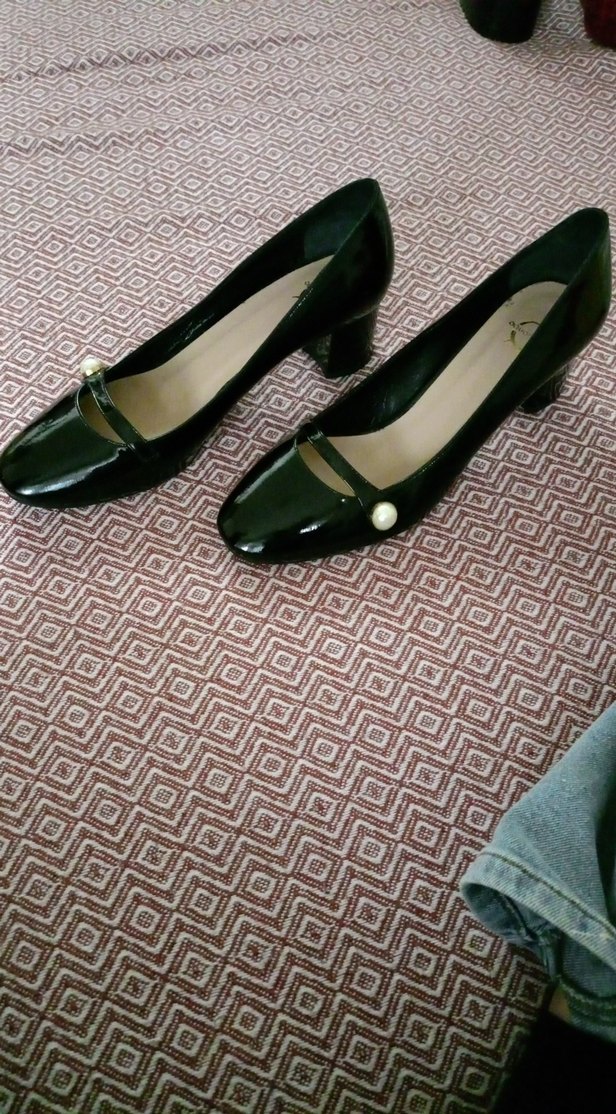 Siyah, tokalı ve inci detaylı topuklu ayakkabılar. Kauçuk malzemeden yapılmış.