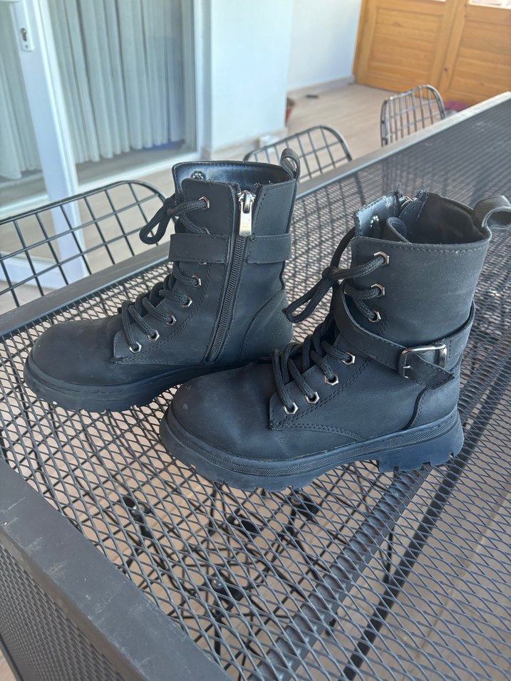 Siyah kauçuk malzemeden yapılmış, platform topuklu goth botlar. Tokalı kayışları ve yan fermuarları bulunur. Günlük sokak stili için uygundur.